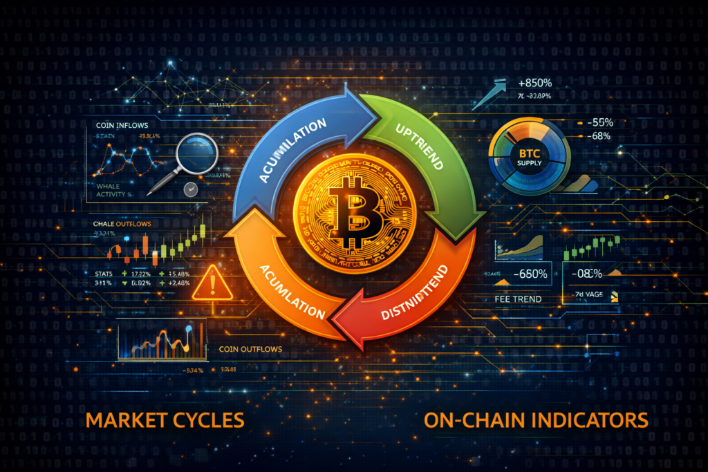 Extended accumulation phases often precede major upward moves, while periods of heavy distribution tend to occur near market tops. On-chain indicators help identify where Bitcoin may be within its broader cycle.